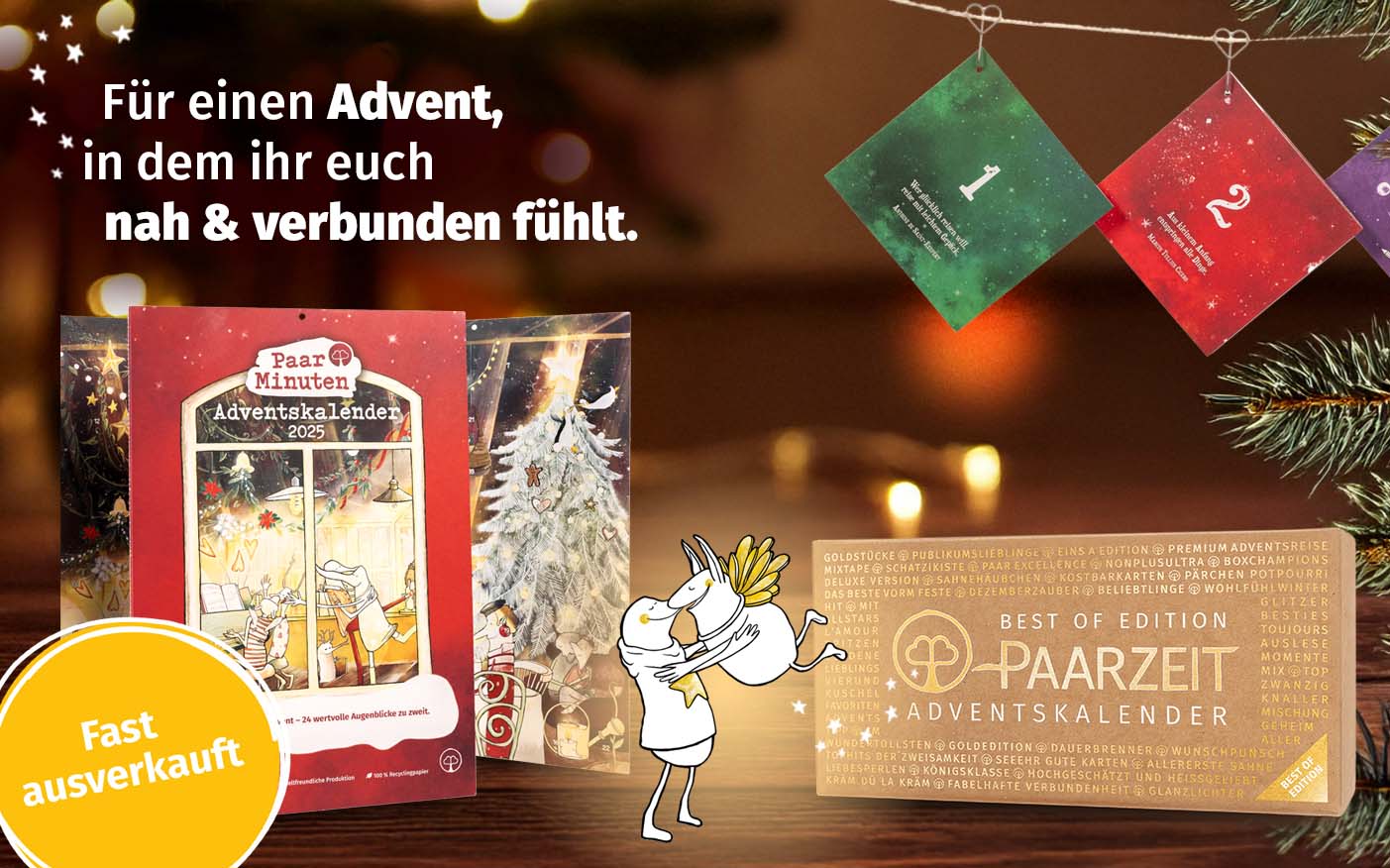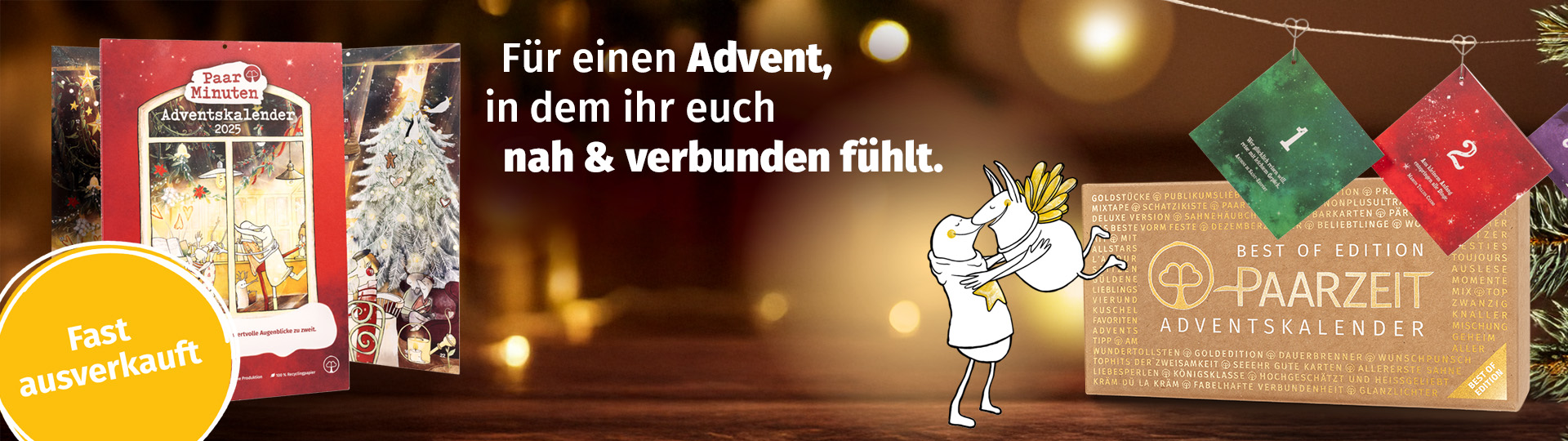 Unsere Adventskalender begleiten euch durch den Advent und stärken eure Liebe. Ihr schenkt euch täglich etwas Zeit nur für euch als Paar – ganz egal, wie trubelig es im Dezember ist.