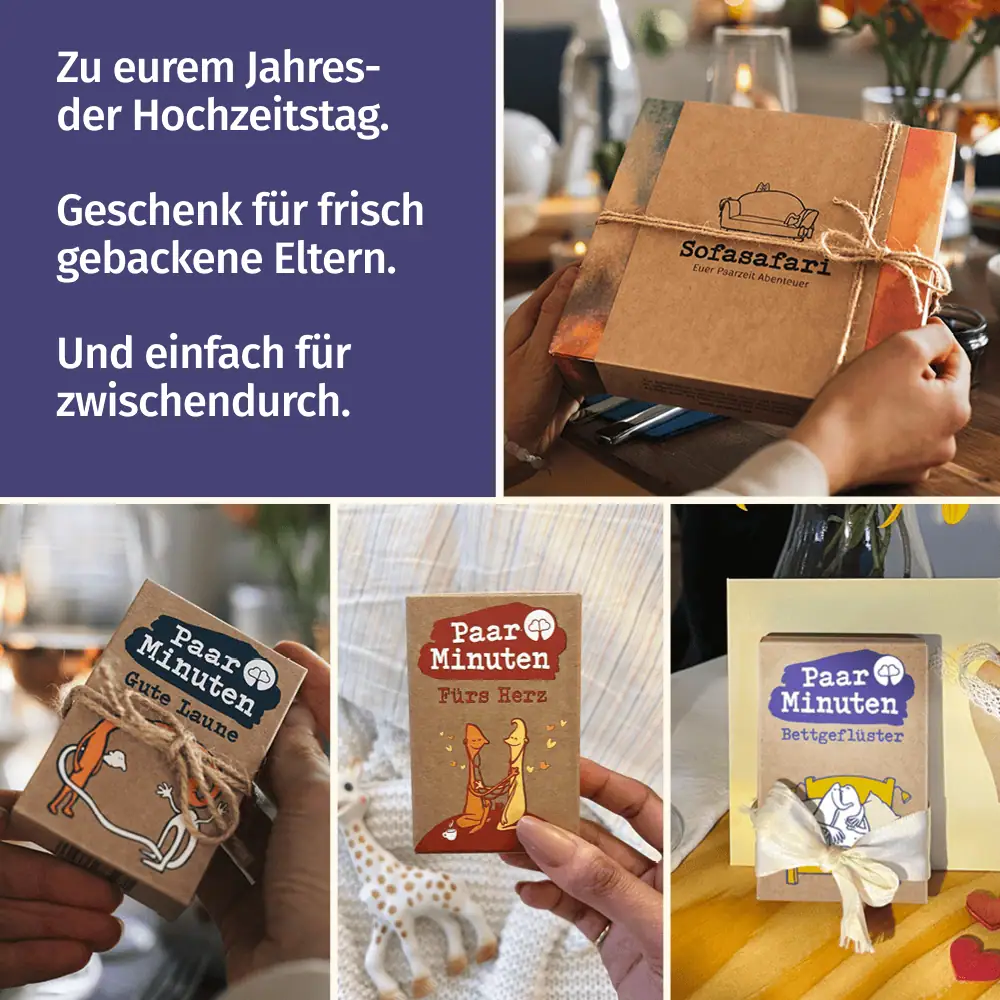 Ich war erst skeptisch ob es nicht „zu kitschig“ ist für uns. Aber ich wurde positiv überrascht. Die Kategorien sind kurzweilig und ganz unterschiedlich was länge und Intensität angeht. Man kommt schön ins Gespräch. Wir hatten schon eine feine Paarzeit.