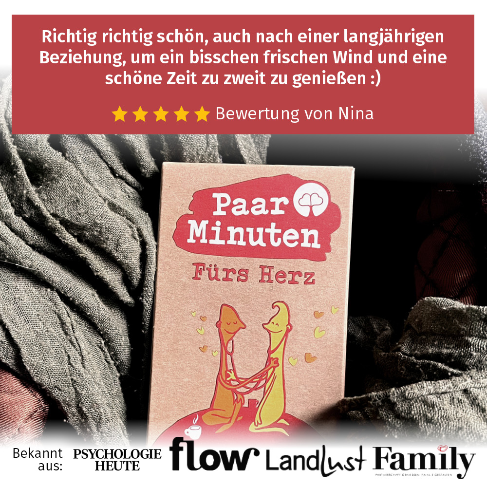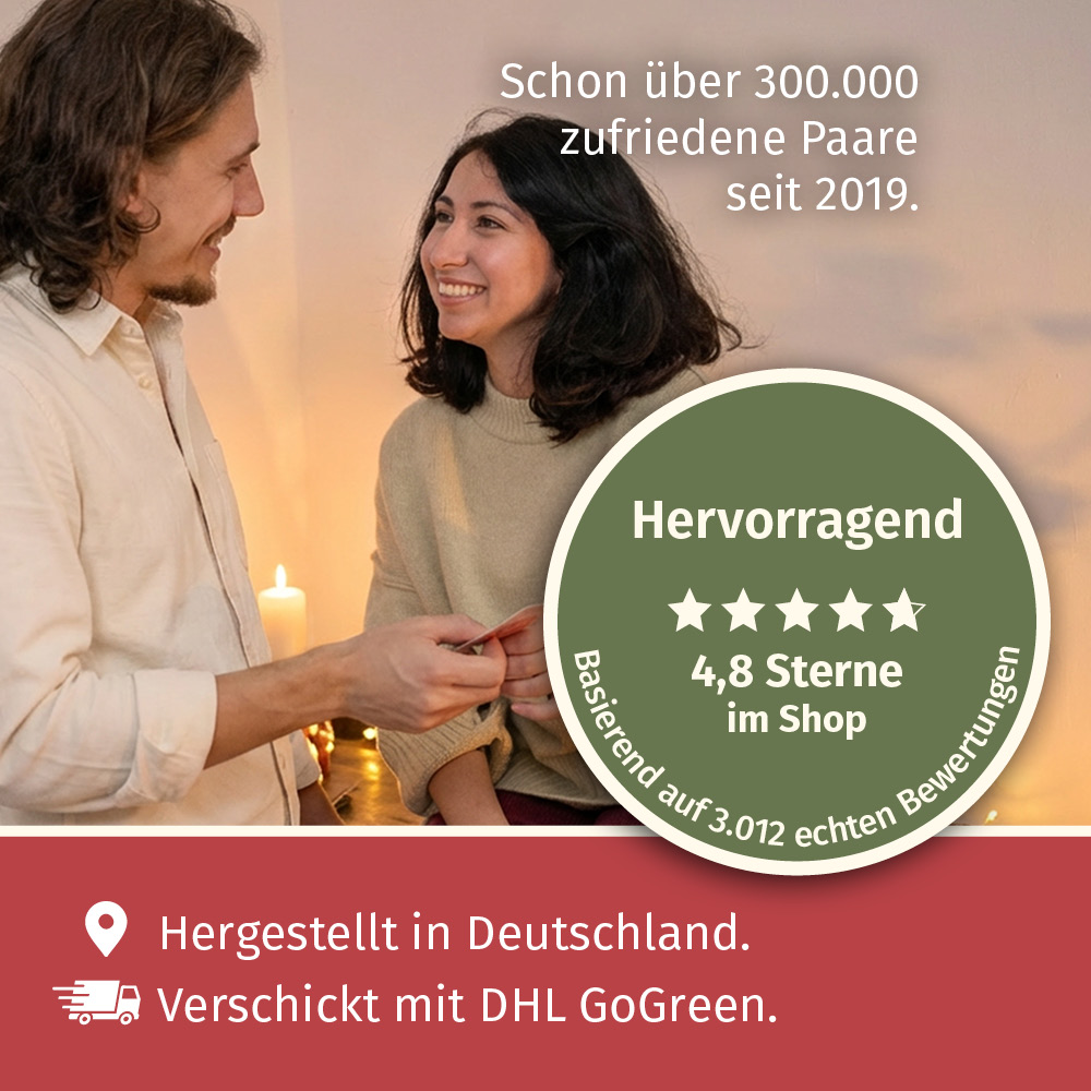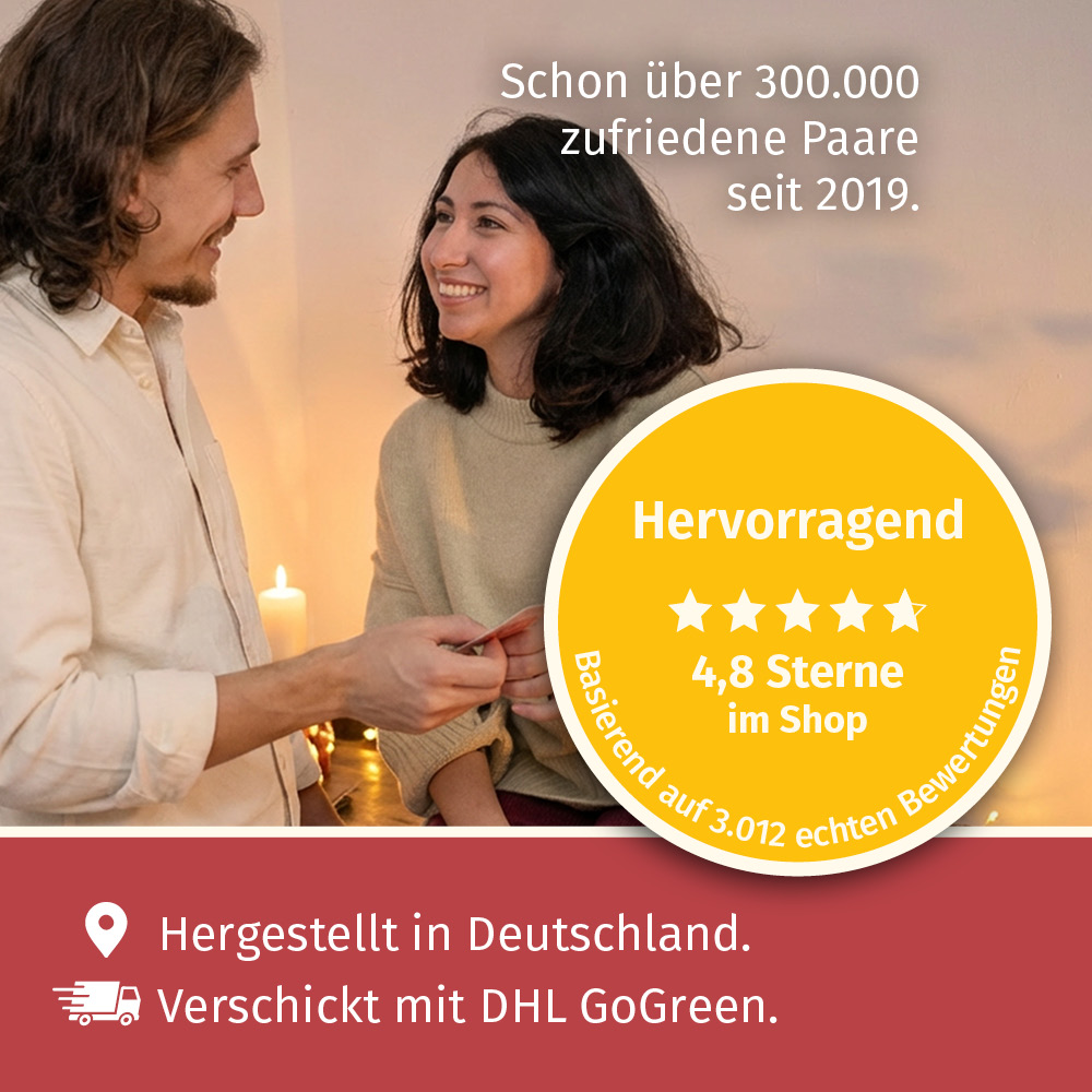 Wir freuen uns, dass sich in Deutschland, Österreich, Frankreich und der Schweiz schon so viele Menschen für ein Paarzeit-Produkt entschieden haben. Euer positives Feedback und eure Erfahrungen motivieren uns, weiterhin mit ganz viel Liebe Produkte für euch zu entwickeln.