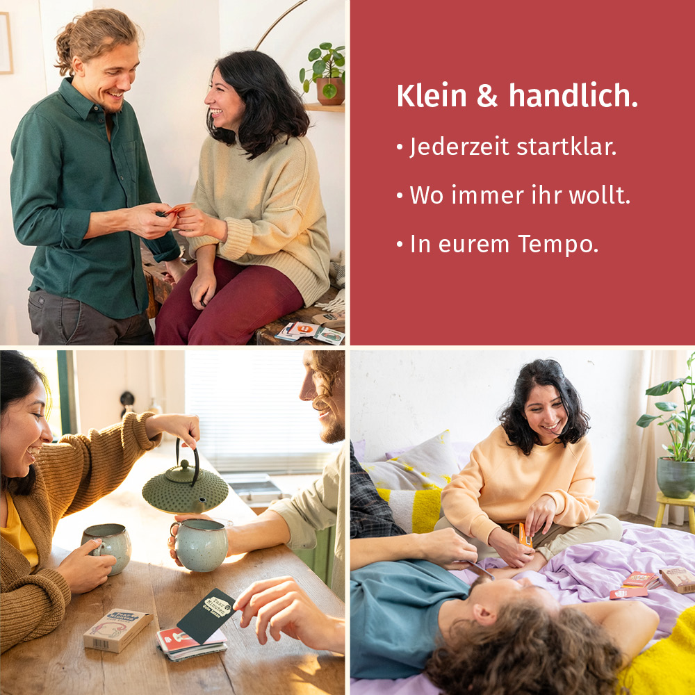 Ich war erst skeptisch ob es nicht „zu kitschig“ ist für uns. Aber ich wurde positiv überrascht. Die Kategorien sind kurzweilig und ganz unterschiedlich was länge und Intensität angeht. Man kommt schön ins Gespräch. Wir hatten schon eine feine Paarzeit.