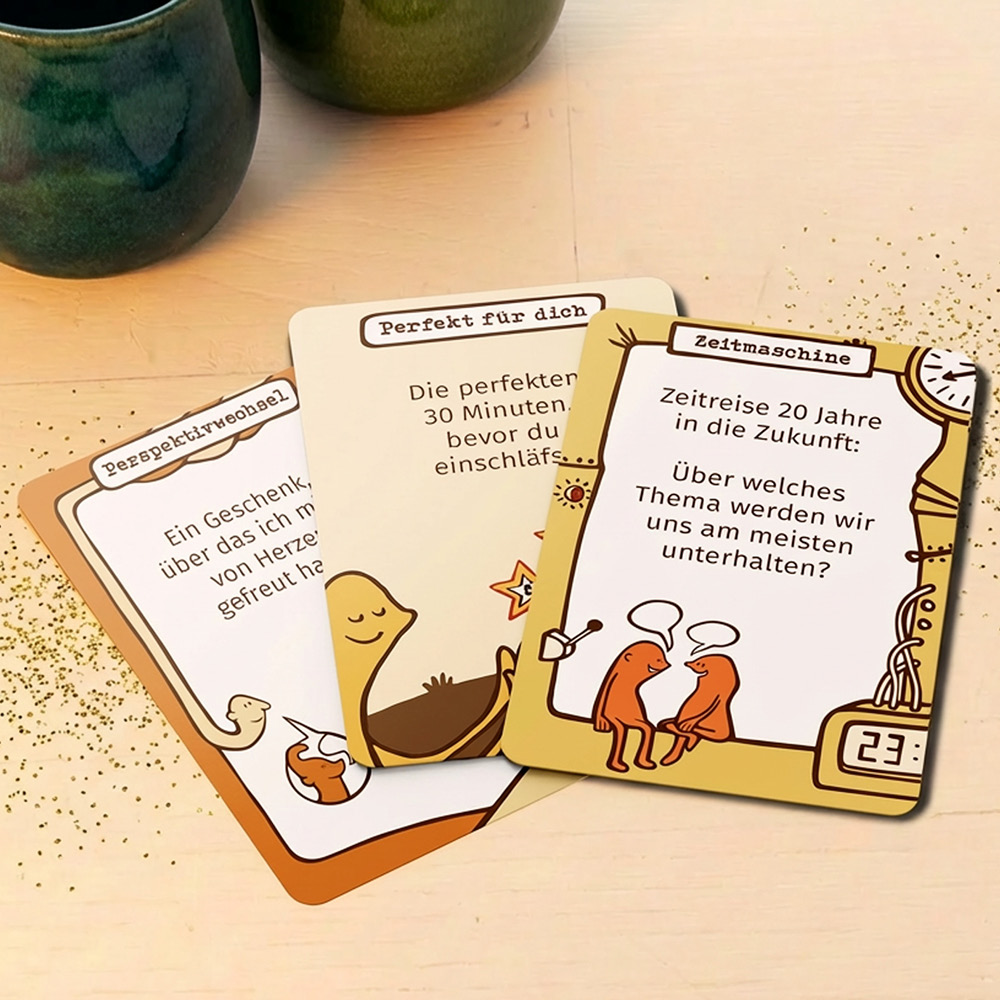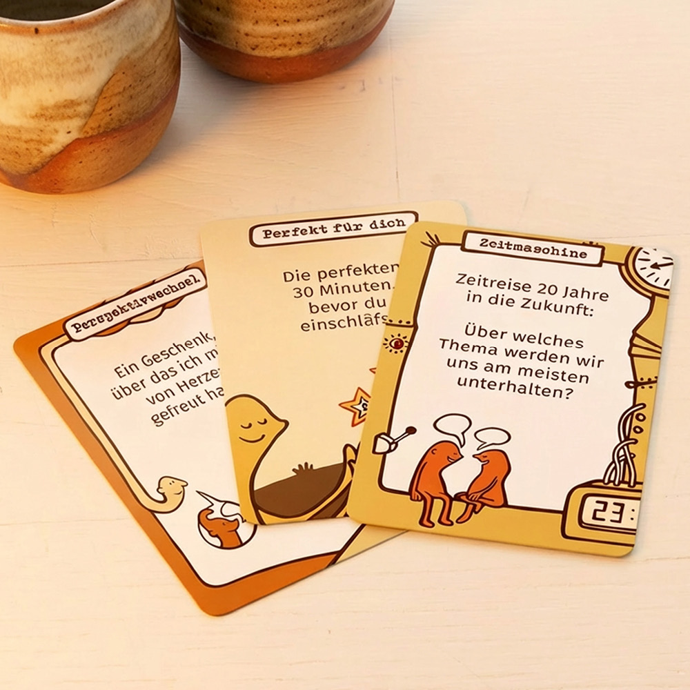 Ihr könnt die Fragekarten als Start in den Tag, abends auf dem Sofa, beim Essen oder einfach mal zwischendurch für kurze Gesprächsimpulse nutzen. Einige Paare machen auch ein Abendritual daraus und ziehen jeden Abend vor dem Schlafengehen eine einzige Karte.