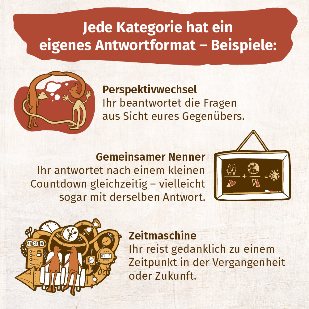 Für jede Kategorie gibt es ein eigenes Antwortformat. Außerdem lassen die Kategorien ein wenig erahnen, in welche Richtung die Kärtchen thematisch gehen. Hier ein paar Beispiele: