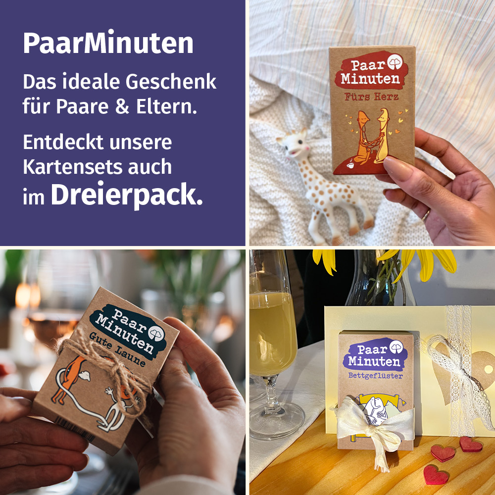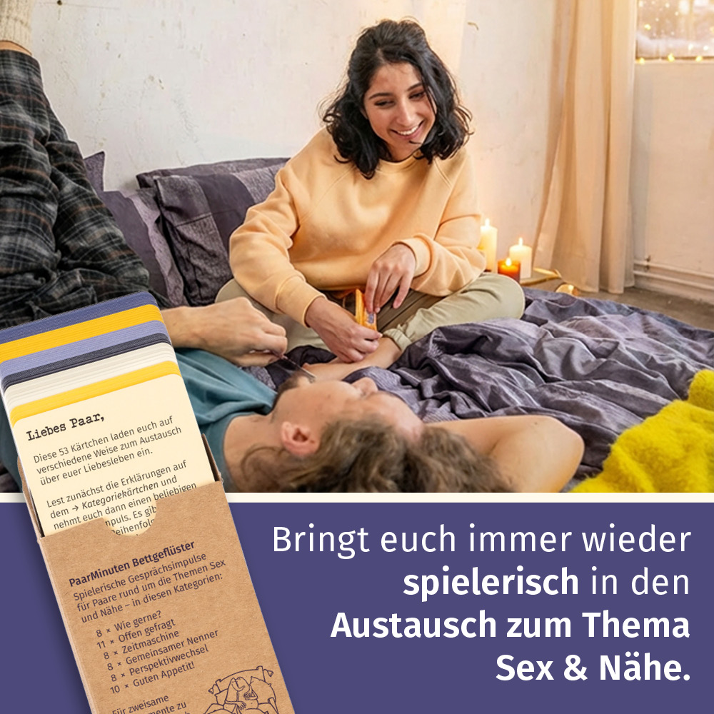In den letzten Jahren haben sich unsere Kund:innen vermehrt Gesprächskarten gewünscht, in denen es explizit um ihr Liebesleben geht. Mit PaarMinuten Bettgeflüster kommen wir diesem Wunsch nach und möchten Paare einladen, sich mit Leichtigkeit über die Themenbereiche Sexualität, Intimität und Nähe auszutauschen.