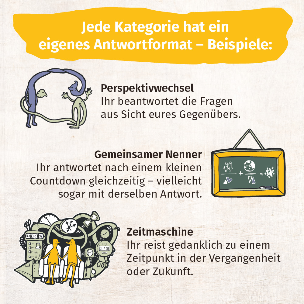Für jede Kategorie gibt es ein eigenes Antwortformat. Außerdem lassen die Kategorien ein wenig erahnen, in welche Richtung die Kärtchen thematisch gehen. Hier ein paar Beispiele: