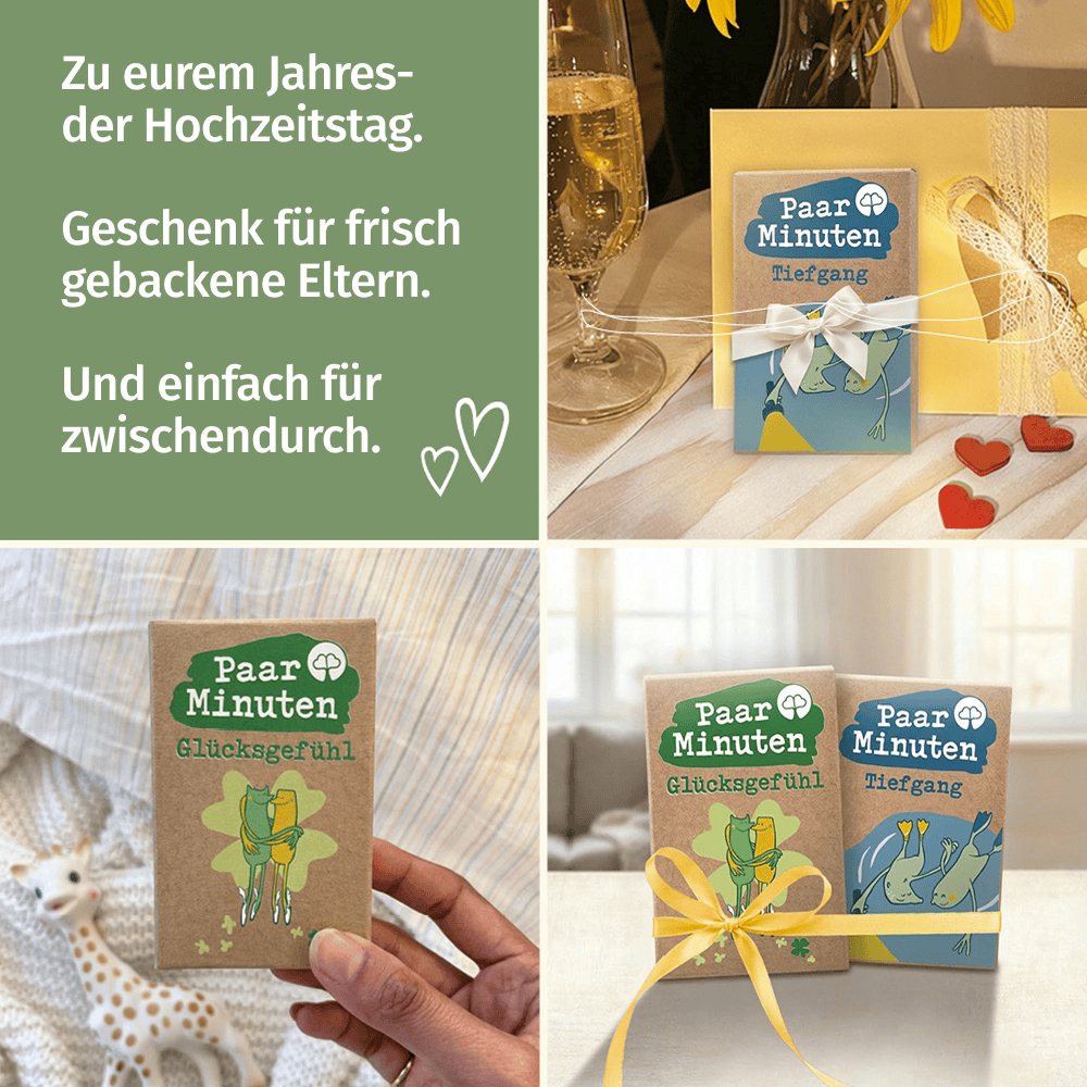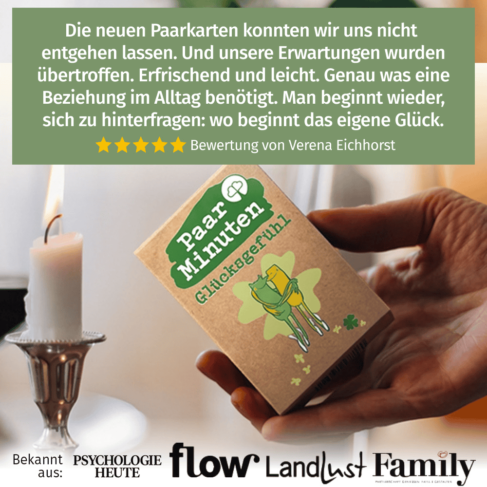 Ja, auf jeden Fall – gerade dann ist dieses Kartenset perfekt für euch. PaarMinuten-Kartensets wurden nämlich extra entwickelt, damit man sie überall mit hinnehmen und auch mit ganz wenig Zeit nutzen kann. Schon ein paar Minuten reichen aus, um eurer Beziehung etwas Gutes zu tun.