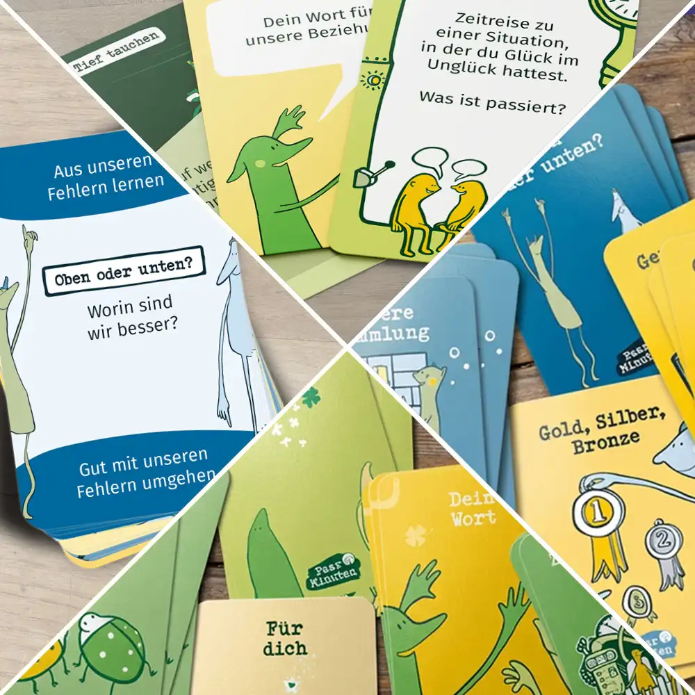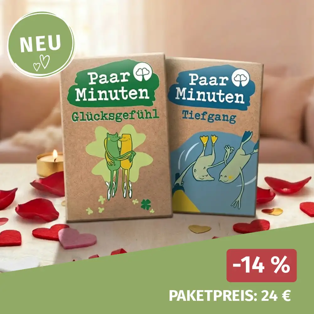 Wir besitzen bereits die anderen Kartensets von Paarzeit, die uns schon viele schöne Stunden intensiver Gespräche beschert haben und uns dabei geholfen haben, über Themen zu sprechen, die wir sonst vermutlich nicht bedacht hätten. Dabei gibt es immer viel zum Nachdenken, zur Selbstreflexion, zum Lachen und zum Schwelgen – sowohl in Erinnerungen an die Vergangenheit als auch mit Blick in die Zukunft.