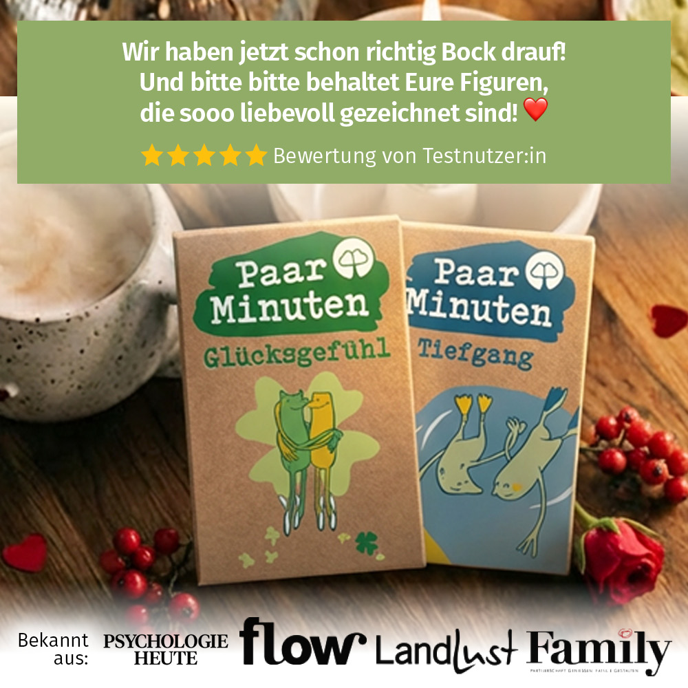 Ich habe richtig Lust darauf, das mit meinem Partner zu spielen. Habe schon viele Fragen und Gesprächsimpulse getestet und freue mich sehr, dass ihr etwas mit Tiefgang machen wollt. Denn da findet man nicht viel gutes und ich mag euren Stil sehr. 🙂