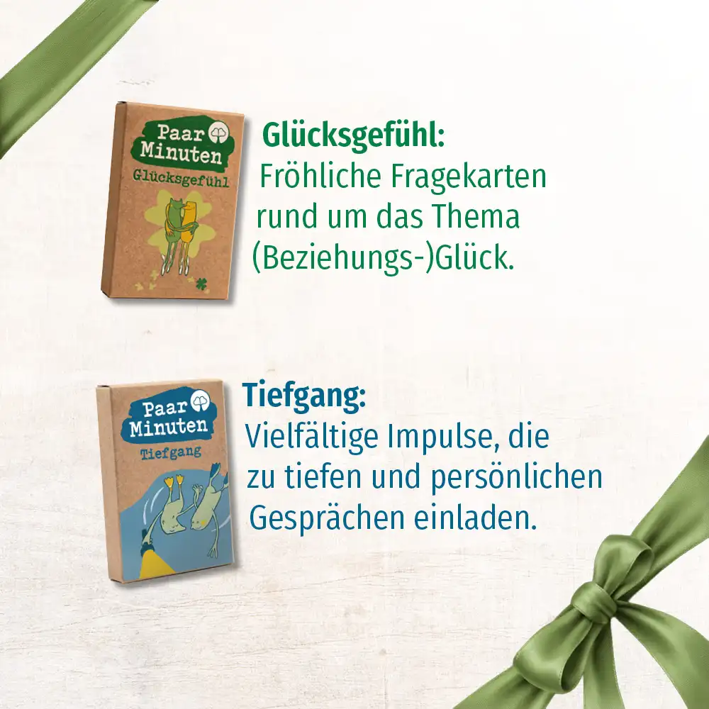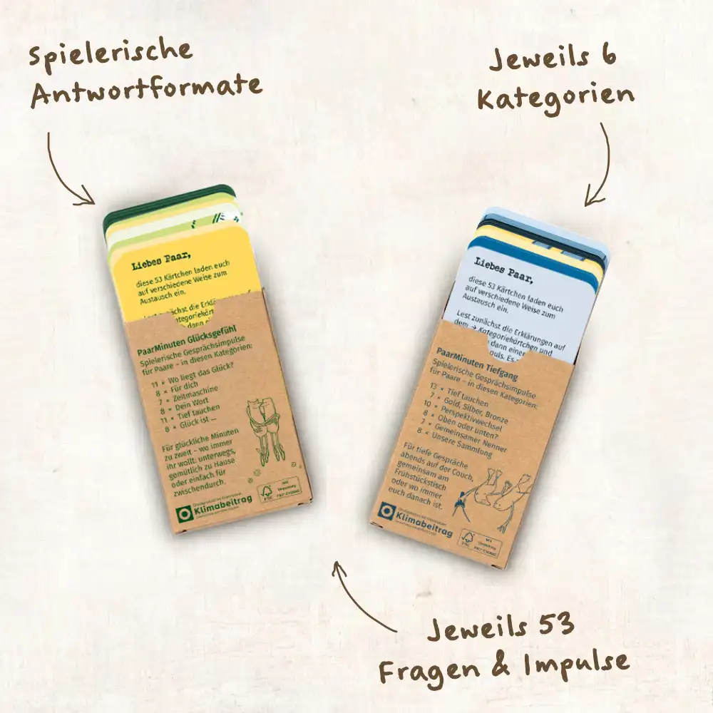 Die beiden neuen Kartensets „Glücksgefühl“ und „Tiefgang“ haben wir diese Woche erhalten und sind begeistert. Die Gestaltung ist wieder wunderschön und lädt direkt dazu ein, die Karten gemeinsam durchzugehen. Interessant sind auch die neuen Kategorien, etwa die Gewichtung von Aussagen, die neue Gesprächsimpulse und Sichtweisen eröffnen und zu spannenden Diskussionen anregen.