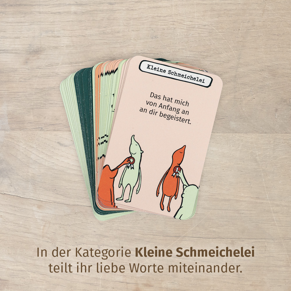 Sehr schöne Idee,spielerisch ins Gespräch zu kommen.Sehr interessante Fragen und Anregungen. Auch die Aufmachung der Internetseite und auch der Karten ist sehr schön und ansprechend gestaltet. Was mir ebenfalls gefallen hat,das die Karten passgenau in einem entsprechenden Karton lagen. Man sieht,wie viel Liebe und Hingabe in Allem steckt.Die nachhaltige Verpackung finde ich zudem sehr gut. Ich werde mir die anderen Kartensets auf jeden Fall auch noch zeitnah holen.