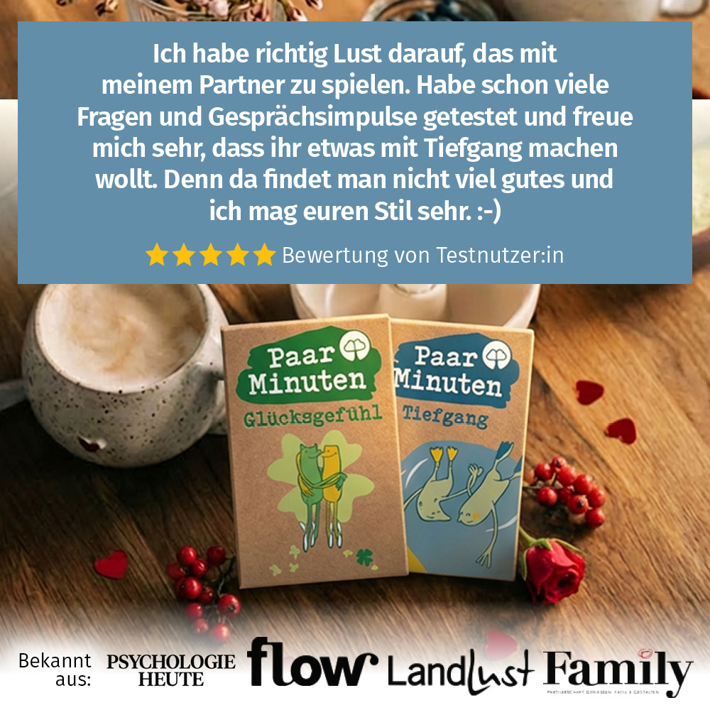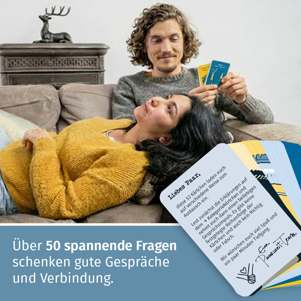Ich habe richtig Lust darauf, das mit meinem Partner zu spielen. Habe schon viele Fragen und Gesprächsimpulse getestet und freue mich sehr, dass ihr etwas mit Tiefgang machen wollt. Denn da findet man nicht viel gutes und ich mag euren Stil sehr. 🙂