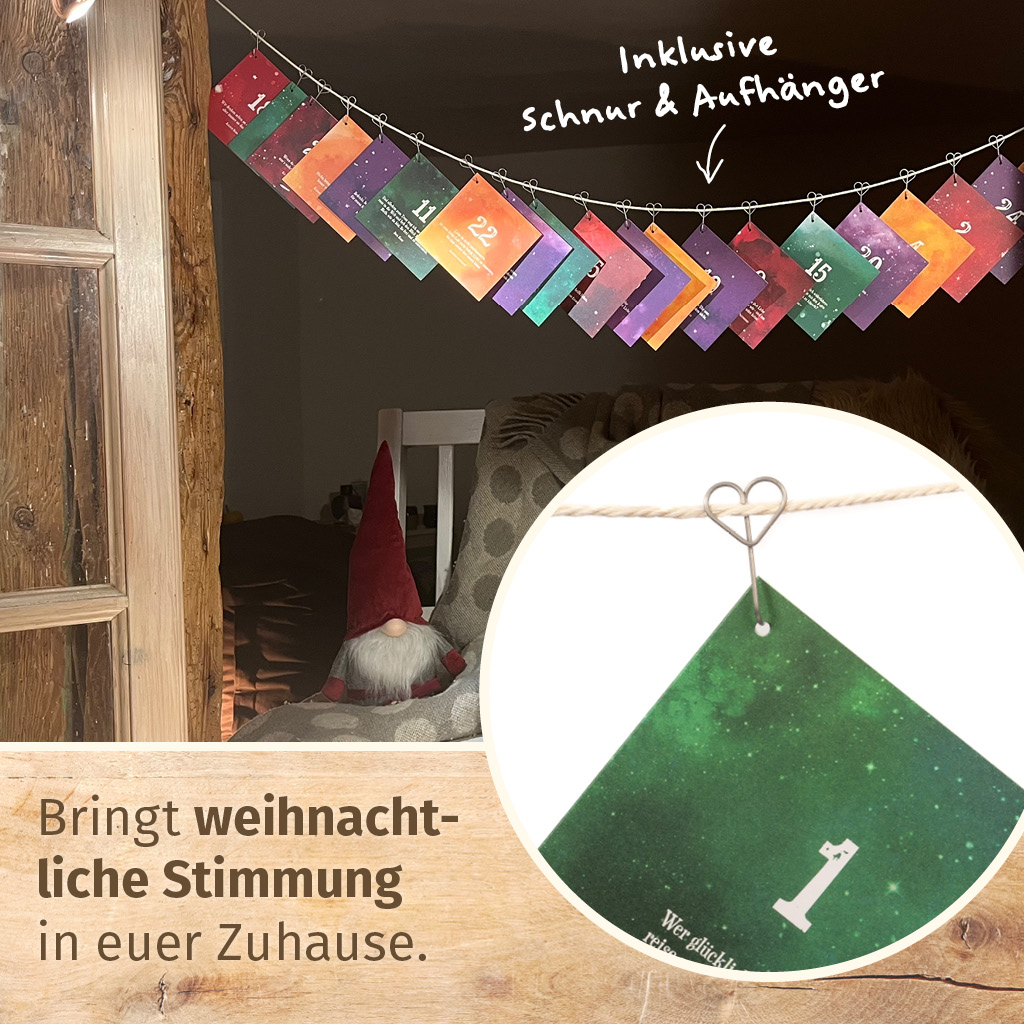 Der Kalender gefällt uns optisch sehr, da er natürlich gehalten ist. Die Schnur und die Befestigung ist eine andere als aus der Edition 4 zB, was wir ebenfalls besser finden. Die Karten haben ein kleines Loch zum aufhängen an den Haken, welche wirklich hübsch sind und an der Schnur fest sitzen, sodass die Karten auf der Schnur auch nicht verrutschen. Inhaltlich sehr coole gedankenreisen, die zum weiterquatschen anregen. Wir hatten bereits jetzt viele interessante Gespräche dank euch! Bei der Illustration sieht man, dass ihr euch Mühe gegeben habt 🙂 Nächstes Jahr probieren wir eine neue Edition 🙂