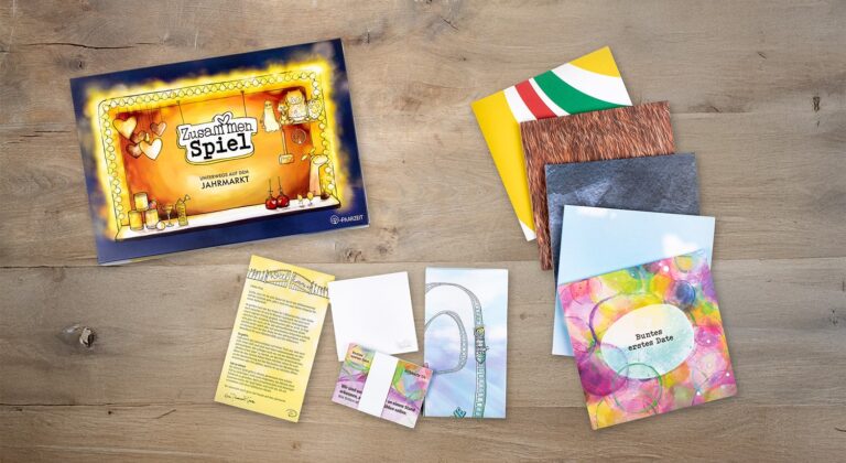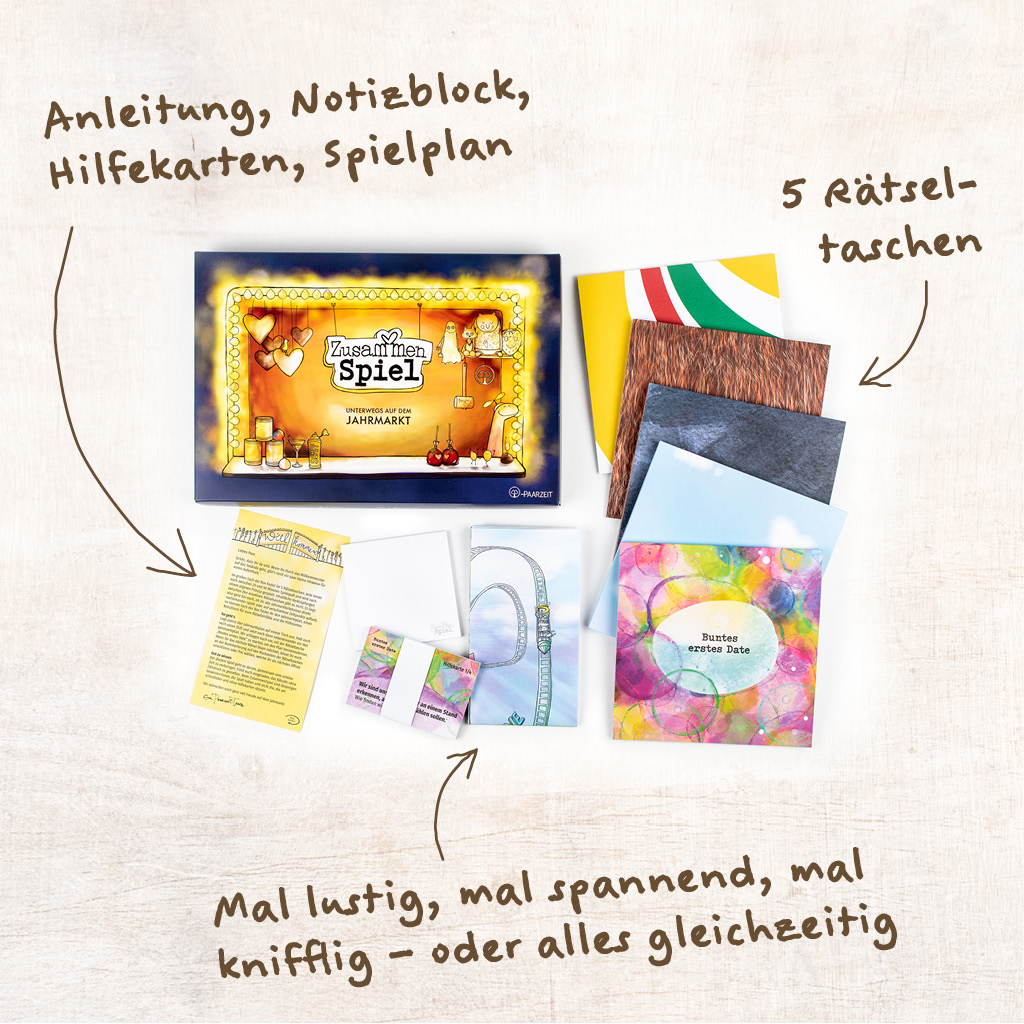 Ist das ZusammenSpiel also eine Art Escape Game? Jein. Ähnlich wie bei Escape-Games löst ihr gemeinsam Rätsel. Anders ist, dass ihr in eurem eigenen Tempo spielt und in einer fröhlich-verrückten Welt unterwegs seid, anstatt unter Zeitdruck einer brenzligen Situation zu entkommen. Eine weitere Gemeinsamkeit zu Escape Games ist, dass man das Spiel als Paar nur einmal spielen kann, da man danach die Rätsel kennt. Anders ist aber, dass alle Elemente des Spiels so gestaltet sind, dass sie weder beschrieben, zerschnitten noch zerrissen werden müssen. So könnt ihr das Spiel super an andere weitergeben.