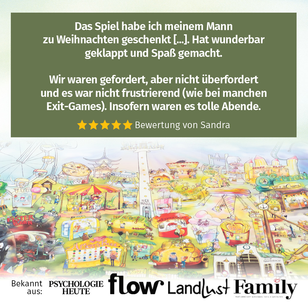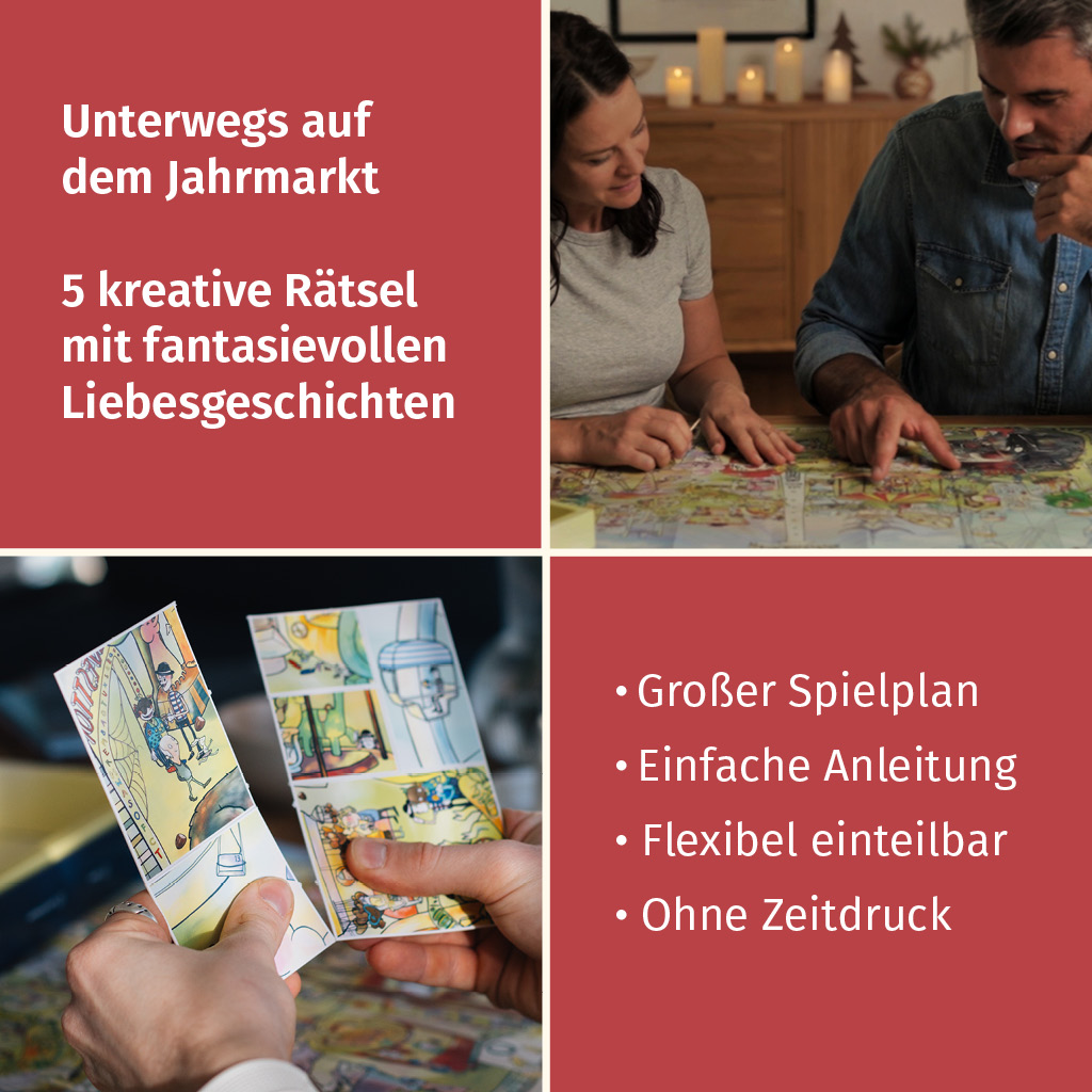 Euer Ziel ist es, 5 unterschiedliche Rätsel zu lösen. Dafür nutzt ihr einen großen Jahrmarktplan und verschiedene Materialien für jedes Rätsel. Beispielsweise übernehmt ihr einen kuriosen Fall der Jahrmarktpolizei oder könnt herausfinden, was ein verkleidetes Pärchen hinter den Kulissen des Jahrmarkts austüftelt.