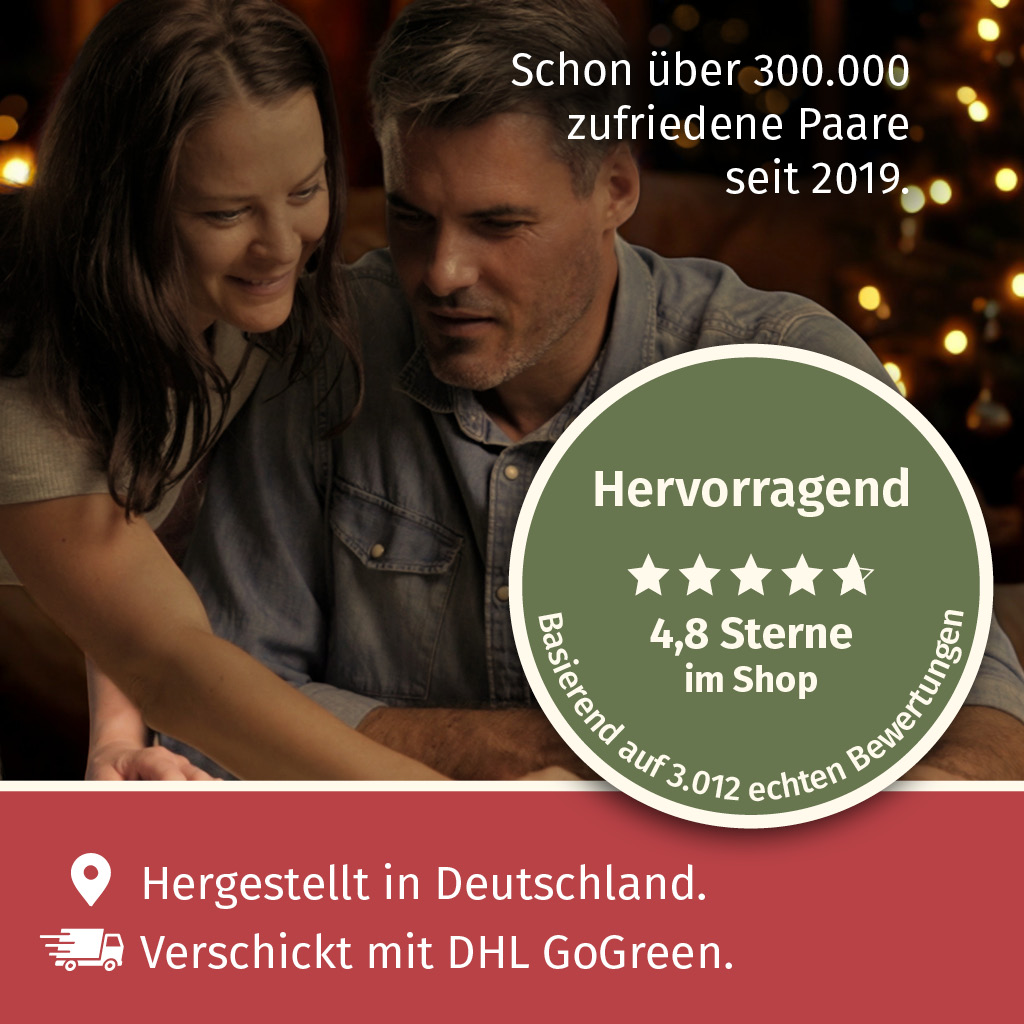 Wir freuen uns, dass sich in Deutschland, Österreich, Frankreich und der Schweiz schon so viele Menschen für ein Paarzeit-Produkt entschieden haben. Euer positives Feedback und eure Erfahrungen motivieren uns, weiterhin mit ganz viel Liebe Produkte für euch zu entwickeln.